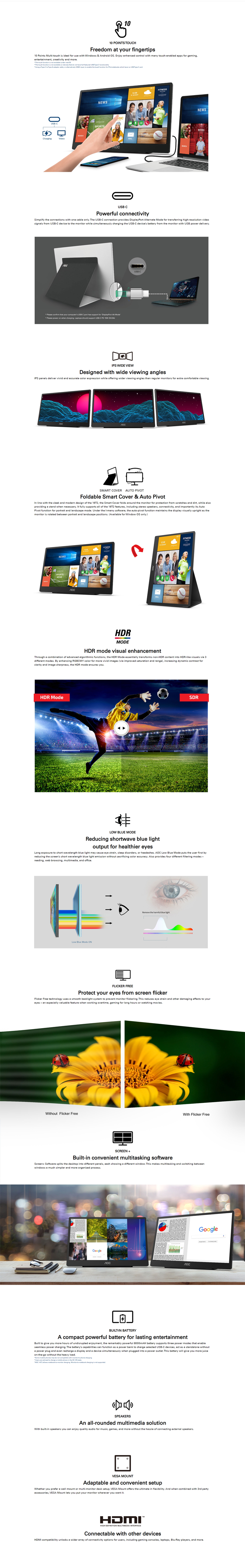 AOC 15.6 inch IPS, USB-C, 10-point Touch, Auto Pivot Portable Monitor 16T2 USB-C HDMI INPUT BUILT-IN SPEAKERS 8000MAH BATTERY WALL-MOUNT 50X50MM