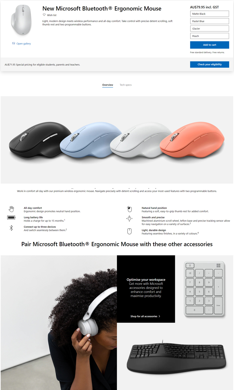 | Product Description | Microsoft Bluetooth Ergonomic Mouse - mouse - Bluetooth 5.0 LE - Glacier |