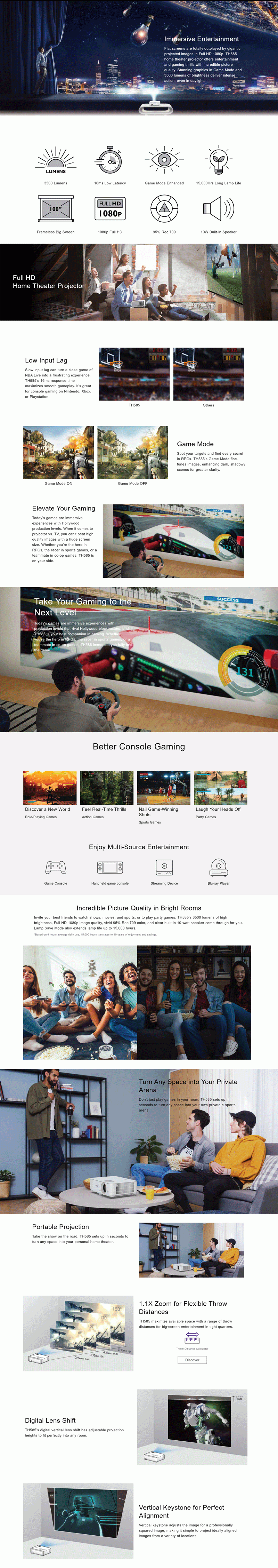 No bulky flat screen needed, with the TH585 you can easily project gigantic images in Full HD 1080p right on your wall. Plug in your projector to throw life-sized hadouken in Street Fighter and score elite multikills in panoramic battle maps. Step right into the game and leave the stress of the day behind you. The TH585 is specially designed with low input lag for real-time gaming thrills. Stunning graphics in Game Mode and 3500 ANSI Lumens of ultra high brightness deliver intense action even in daylight. Invite your friends and experience that bigger is indeed better especially when gaming.