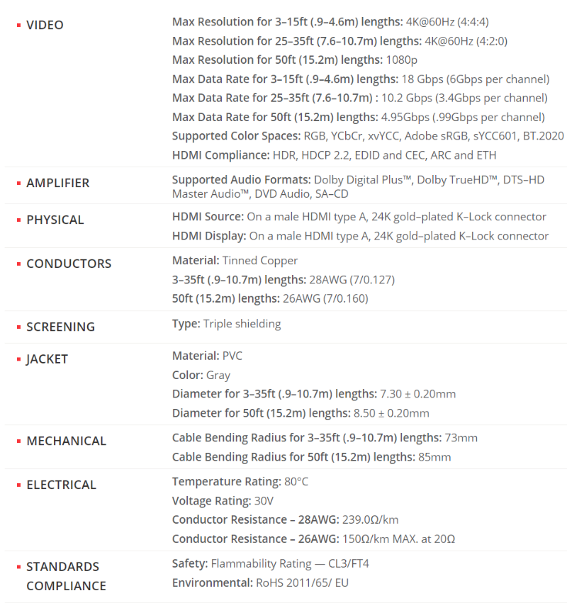 Kramer's C−HM/HM/ETH HDMI cable is a high−performance cable with molded HDMI connectors at both ends. It supports Ethernet Channel, Deep Color, x.v.Color™, Lip Sync, 7.1 PCM, Dolby TrueHD, DTS−HD, CEC and ARC and resolutions up to 4K@60Hz (4:4:4).