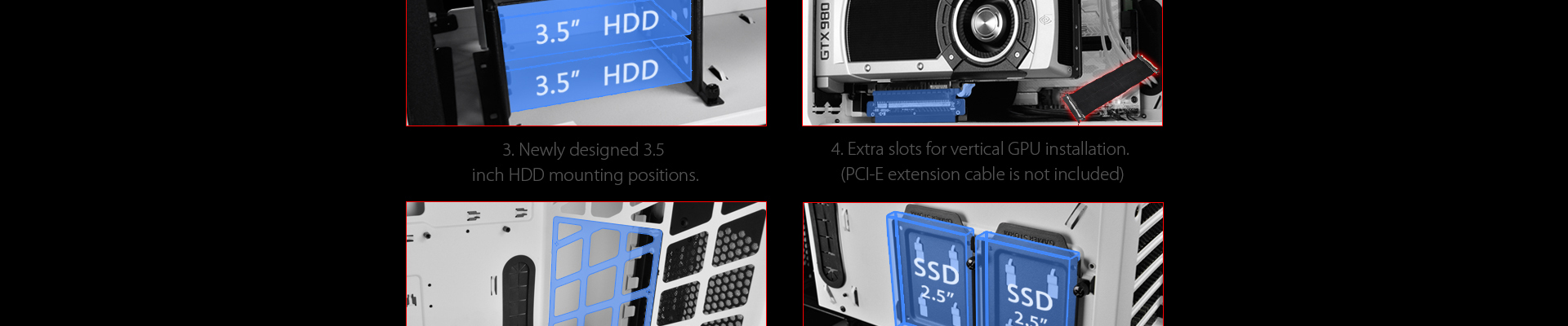 Extra slots for vertical GPU installation(PCI-E extension cable is not included);