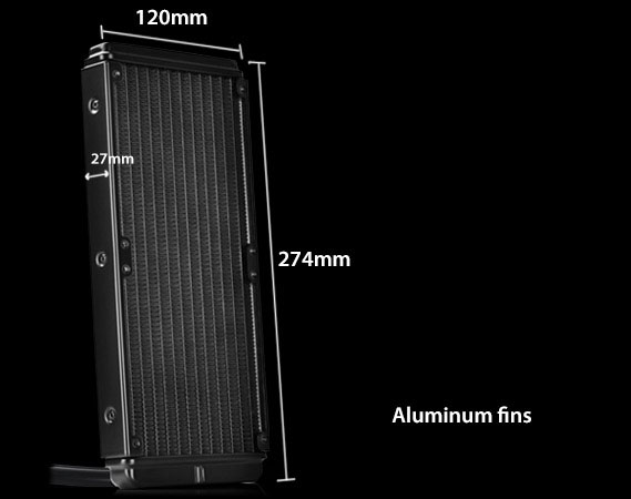 - 240 mm aluminum fin-array optimized for lower fan speeds and noise.