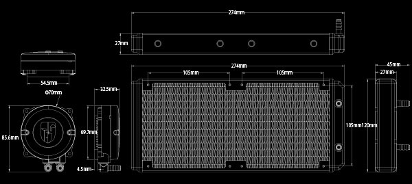 240 mm aluminum fin-array optimized for lower fan speeds and noise. Provided with standard built-in mounting holes for easy switching to newer 120 mm fans.