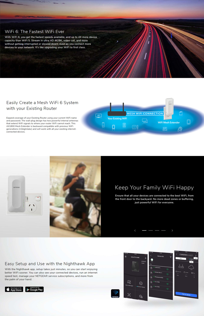 - WiFi 6 Features : Gigabit Internet speeds throughout the home*, 1.5X Better Performance than a Wi-Fi 5 (802.11ac) Extender—4 Stream WiFi with up to 0.6+1.2 Gbps† for fast wireless speeds**, More WiFi for More Devices— OFDMA allows efficient data transmission up to 4 devices at the same time§. Uplink OFDMA improves scheduling during high volumes of upload traffic, Up to 4 Simultaneous WiFi Streams—4-stream MU-MIMO‡ enables up to four (4) 1x1 devices to stream content at the same time