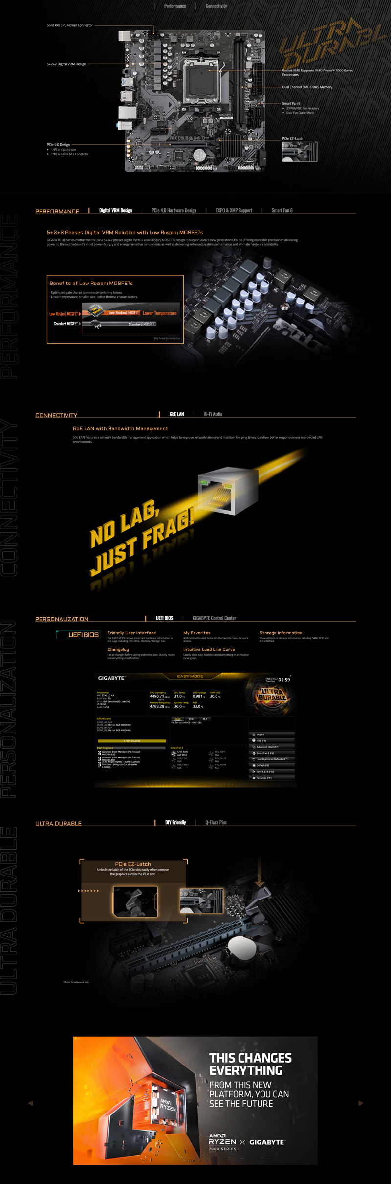 - AMD Socket AM5, support for: AMD Ryzen™ 7000 Series Processors (Go to GIGABYTE's website for the latest CPU support list.)