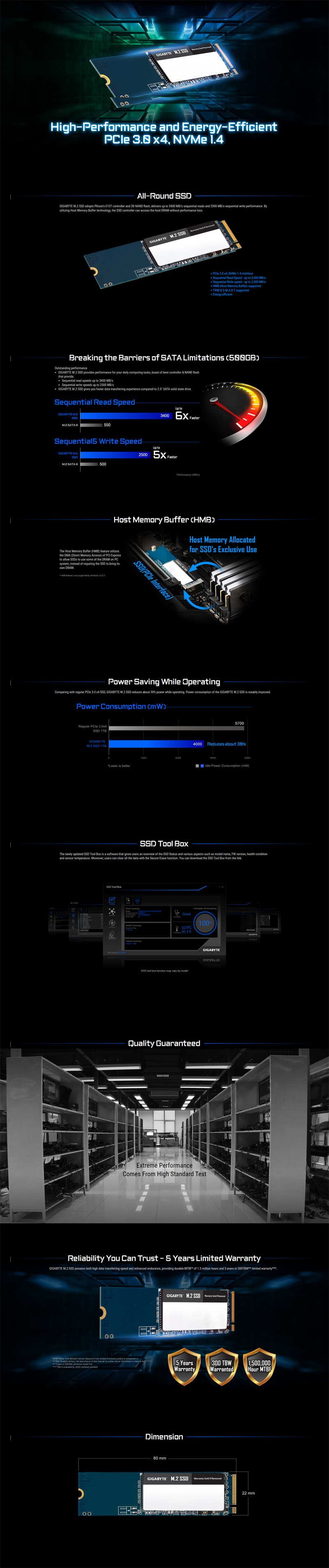 Gigabyte M.2 SSD 500GB, PCI-E 3.0 x4, NVMe 1.4, 2280, 3400 MB/s Read, 3200 MB/s Write, 300 TBW, 5 Years Warranty GM2500G