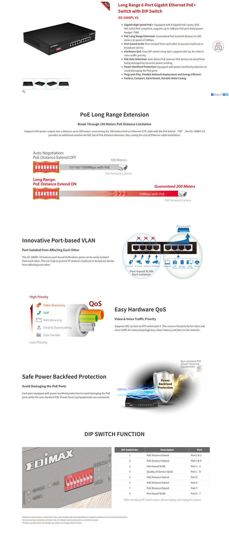 Edimax GS-1008PL V2 Long Range 8-Port Gigabit Ethernet PoE+ Switch with DIP Switch, 8x Gigabit POE ports up to 30W per port, POE over 200m at 10Mbps