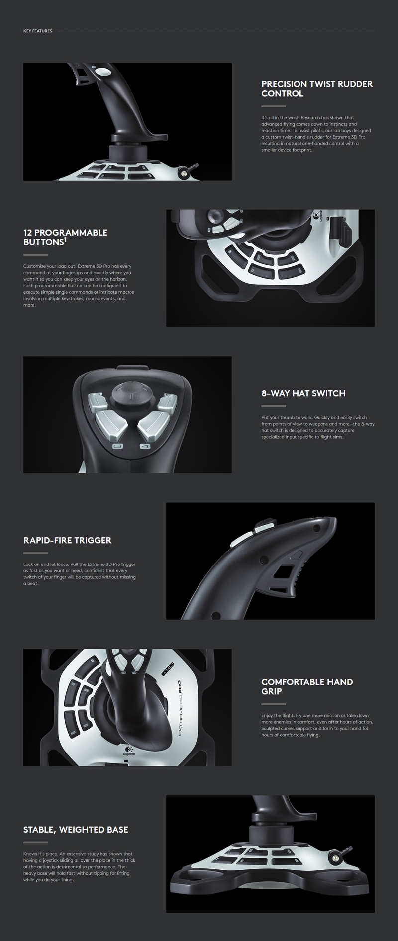 Research has shown that advanced flying comes down to instincts and reaction time. To assist pilots, our lab boys designed a custom twist-handle rudder for Extreme 3D Pro, resulting in natural one-handed control with a smaller device footprint.