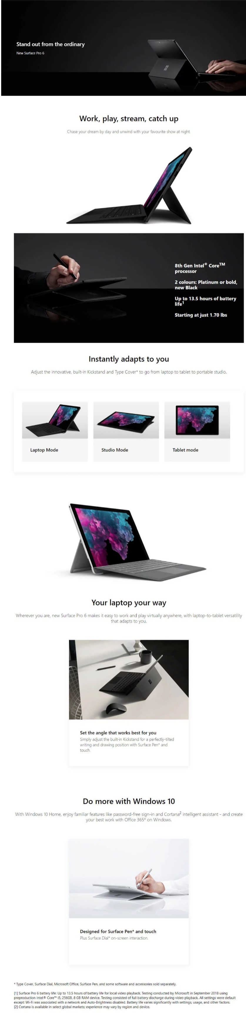 Microsoft Surface Pro 6 - Platinum Intel I5-8250U 8Gb Ram 256Gb Ssd 12.3" Qhd Wifi Bt Windows 10 Home 1 Year Warranty- Retail Kjt-00007