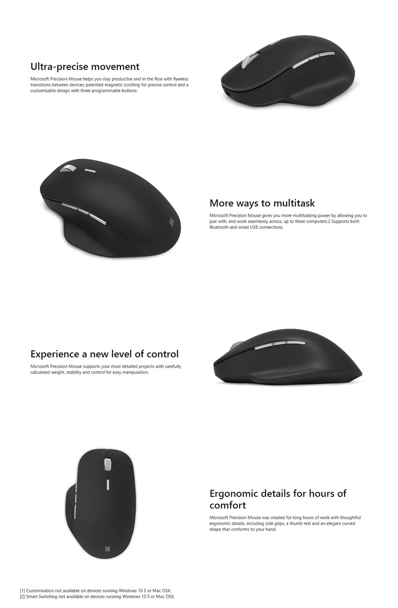Surface Precision Mouse gives you more multi-tasking power by allowing you to work seamlessly accross up to three computers. Supports both Bluetooth and wired USB connctions.