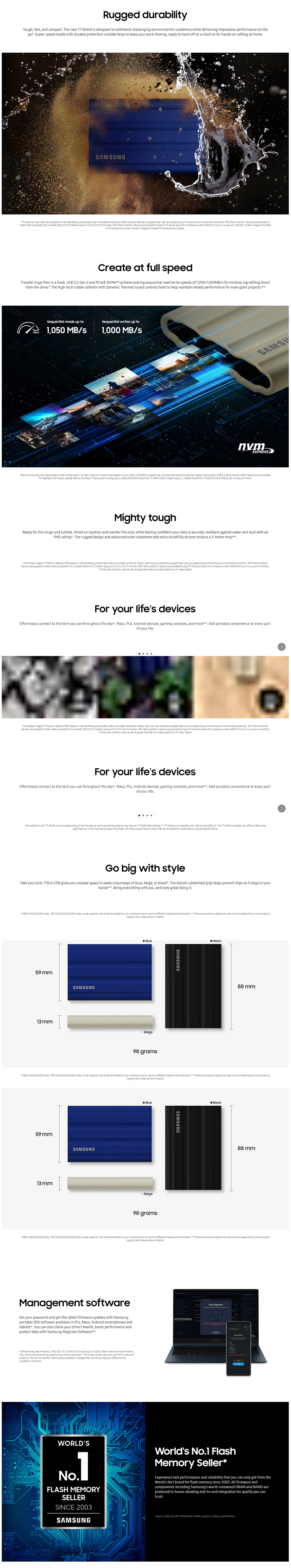 SAMSUNG T7 SHIELD 2TB PORTABLE DRIVE, TYPE-C, UP TO 1050MBs R/W, BEIGE, 3YR WTY MU-PE2T0K/WW