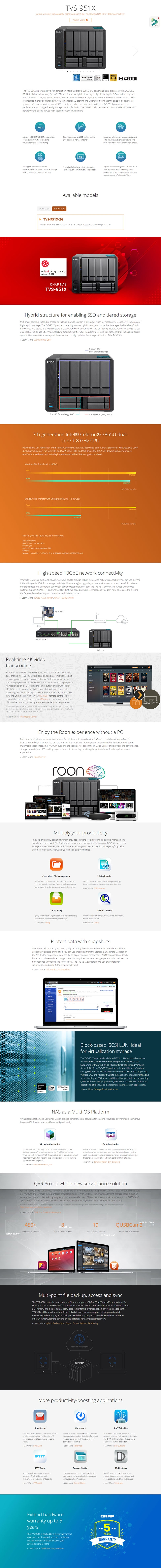 The TVS-951X is powered by a 7th-generation Intel® Celeron® 3865U low-power dual-core processor, with 2GB/8GB DDR4 dual-channel memory (up to 32GB) and features a hybrid drive bay design (including five 3.5-inch drive bays and four 2.5-inch SSD bays) that supports up to nine drives in the same physical space as a 5-bay NAS. When 2.5-inch SSDs are installed in their dedicated bays, you can enable SSD caching and Qtier auto-tiering technologies to boost overall system performance. As the price of SSDs continues to become more accessible, the TVS-951X provides a high-performance and budget-friendly storage solution for SMBs. The TVS-951X also features a built-in 10GBASE-T/NBASE-T port for you to build a 10GbE high-speed network environment.