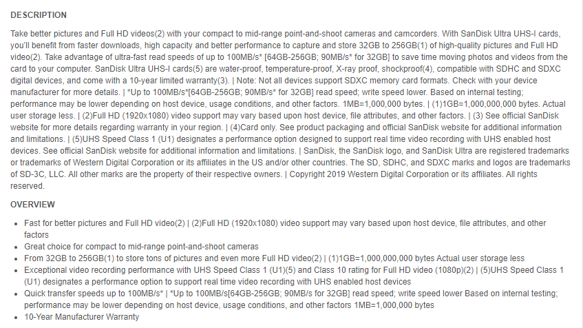 Take better pictures and Full HD videos(2) with your compact to mid-range point-and-shoot cameras and camcorders. With SanDisk Ultra UHS-I cards, you’ll benefit from faster downloads, high capacity and better performance to capture and store 32GB to 256GB(1) of high-quality pictures and Full HD video(2). Take advantage of ultra-fast read speeds of up to 100MB/s* [64GB-256GB; 90MB/s* for 32GB] to save time moving photos and videos from the card to your computer. SanDisk Ultra UHS-I cards(5) are water-proof, temperature-proof, X-ray proof, shockproof(4), compatible with SDHC and SDXC digital devices, and come with a 10-year limited warranty(3). | Note: Not all devices support SDXC memory card formats. Check with your device manufacturer for more details. | *Up to 100MB/s*[64GB-256GB; 90MB/s* for 32GB] read speed; write speed lower. Based on internal testing; performance may be lower depending on host device, usage conditions, and other factors. 1MB=1,000,000 bytes. | (1)1GB=1,000,000,000 bytes. Actual user storage less. | (2)Full HD (1920x1080) video support may vary based upon host device, file attributes, and other factors. | (3) See official SanDisk website for more details regarding warranty in your region. | (4)Card only. See product packaging and official SanDisk website for additional information and limitations. | (5)UHS Speed Class 1 (U1) designates a performance option designed to support real time video recording with UHS enabled host devices. See official SanDisk website for additional information and limitations. | SanDisk, the SanDisk logo, and SanDisk Ultra are registered trademarks or trademarks of Western Digital Corporation or its affiliates in the US and/or other countries. The SD, SDHC, and SDXC marks and logos are trademarks of SD-3C, LLC. All other marks are the property of their respective owners. | Copyright 2019 Western Digital Corporation or its affiliates. All rights reserved.