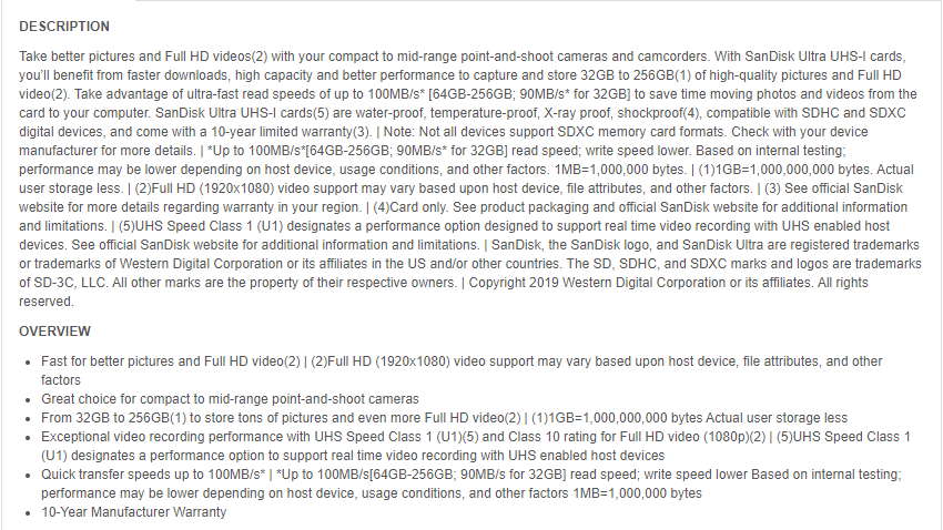 Take better pictures and Full HD videos(2) with your compact to mid-range point-and-shoot cameras and camcorders. With SanDisk Ultra UHS-I cards, you’ll benefit from faster downloads, high capacity and better performance to capture and store 32GB to 256GB(1) of high-quality pictures and Full HD video(2). Take advantage of ultra-fast read speeds of up to 100MB/s* [64GB-256GB; 90MB/s* for 32GB] to save time moving photos and videos from the card to your computer. SanDisk Ultra UHS-I cards(5) are water-proof, temperature-proof, X-ray proof, shockproof(4), compatible with SDHC and SDXC digital devices, and come with a 10-year limited warranty(3). | Note: Not all devices support SDXC memory card formats. Check with your device manufacturer for more details. | *Up to 100MB/s*[64GB-256GB; 90MB/s* for 32GB] read speed; write speed lower. Based on internal testing; performance may be lower depending on host device, usage conditions, and other factors. 1MB=1,000,000 bytes. | (1)1GB=1,000,000,000 bytes. Actual user storage less. | (2)Full HD (1920x1080) video support may vary based upon host device, file attributes, and other factors. | (3) See official SanDisk website for more details regarding warranty in your region. | (4)Card only. See product packaging and official SanDisk website for additional information and limitations. | (5)UHS Speed Class 1 (U1) designates a performance option designed to support real time video recording with UHS enabled host devices. See official SanDisk website for additional information and limitations. | SanDisk, the SanDisk logo, and SanDisk Ultra are registered trademarks or trademarks of Western Digital Corporation or its affiliates in the US and/or other countries. The SD, SDHC, and SDXC marks and logos are trademarks of SD-3C, LLC. All other marks are the property of their respective owners. | Copyright 2019 Western Digital Corporation or its affiliates. All rights reserved.