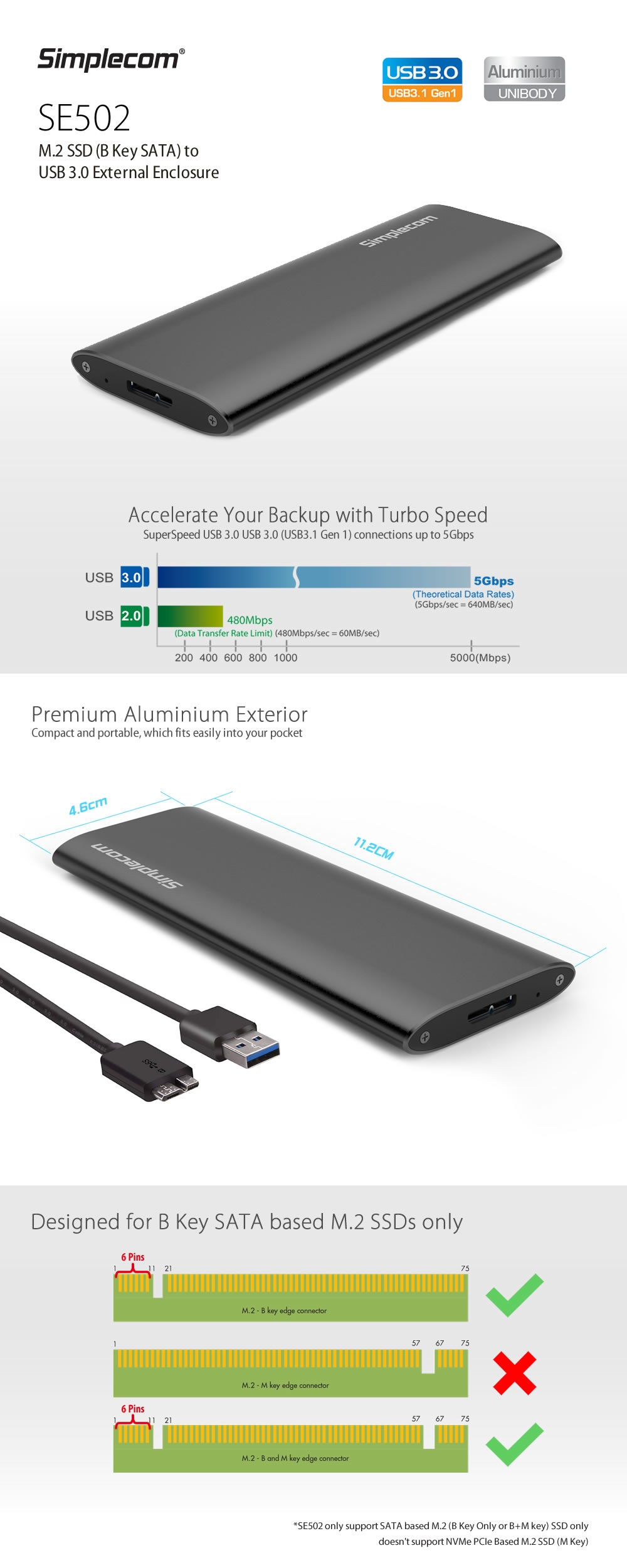 The SE502 external M.2 to USB 3.0 enclosure turns your SATA protocol based M.2 Solid State Drive into a portable, super speed USB 3.0 USB drive.