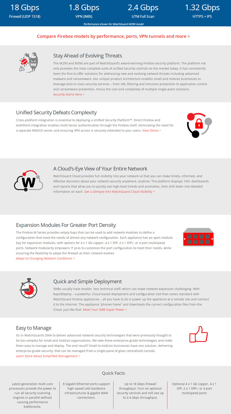 Because smaller companies are generally less protected and easier to break into, small business has become the new big target for cyberattacks. The Firebox M290 and M390 firewalls are specifically engineered to defend all types of small businesses against attacks that are no less fierce than those targeting larger organizations.