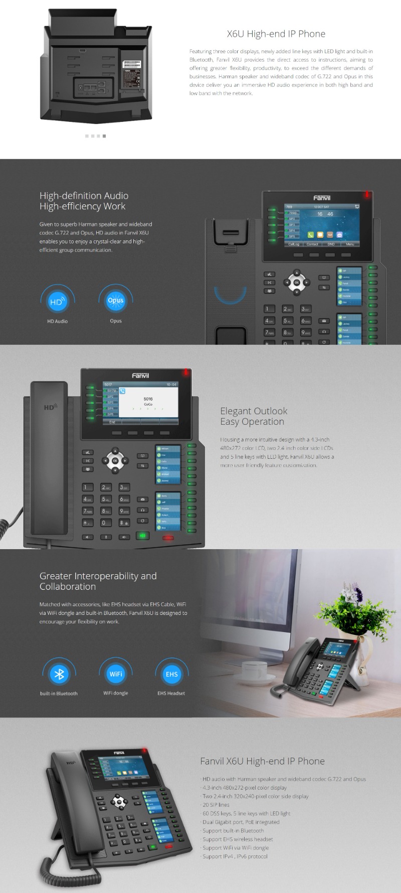 Fanvil X6U Enterprise IP Phone - 4.3' (Video) Colour Screen, 20 Lines, 60 x DSS Buttons, Dual Gigabit NIC, Built in Bluetooth (X6U)